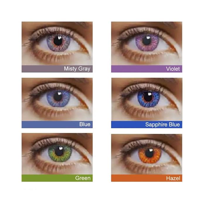 FreshLook Colors comes in 6 colour variants. Green, Blue, Misty Grey and Violet are more suited to lighter eyes, while Hazel and Sapphire Blue colours are best suited for darker eyes.